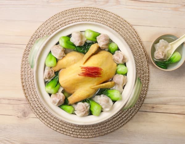 Cook Shanghai wonton and Chinese cabbage in water. Take them out and put into chicken soup to serve.