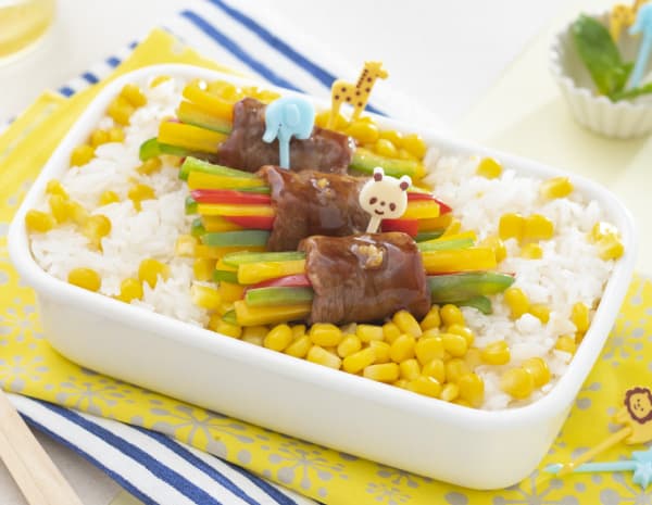 Cook the beef roll using a non-stick pan and place it on the corn rice once cooked.