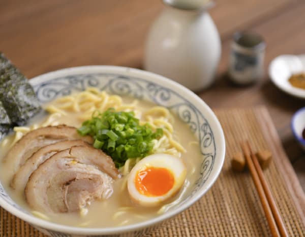 4. 4. Put a bag of Pork Bone Thick Soup into a pot of cold water. After boiling for 2 minutes, pour the soup over, the noodles. Add in Japanese char siu, soft- boiled egg, seaweed and green onion.