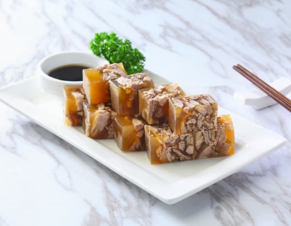 Strain the liquid (3). Pour over the lamb meat in the square container. Cool and chill the container in the refrigerator until set. Cut into pieces and serve.