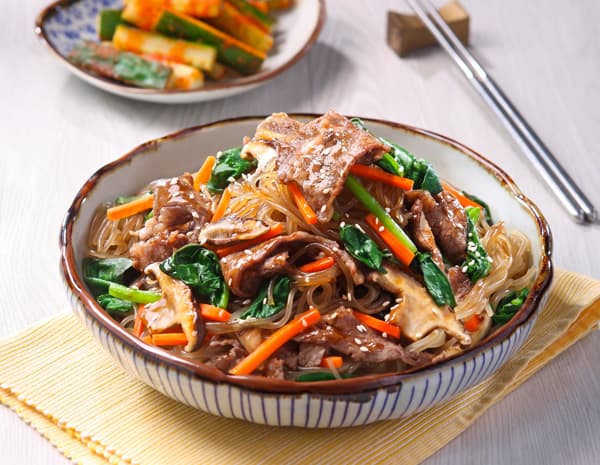Sauté minced garlic with 1 tbsp oil in heated pan. Add sliced beef chuck, carrot, fresh mushrooms, and spinach in for stir-frying until all is cooked. Add in glass noodle, it is then ready to serve.