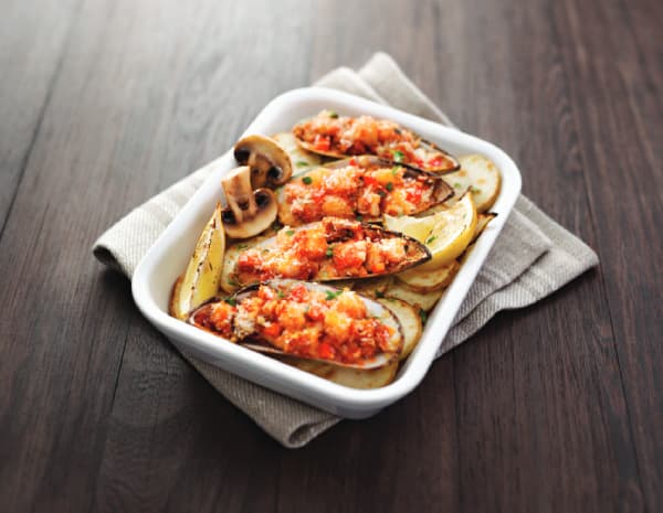 Remove mussel meat from shells and dice. Mix mussel, shrimp and bell peppern with marinade. Divide the filling into 12 portions and stuff back on mussel shells