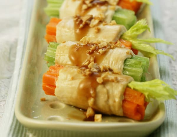 Put some celery and carrot on chicken slices. Roll up to form rolls. Arrange rolls on serving plate. Steam over high heat for 10 minutes or until done. Pour away excess liquid.