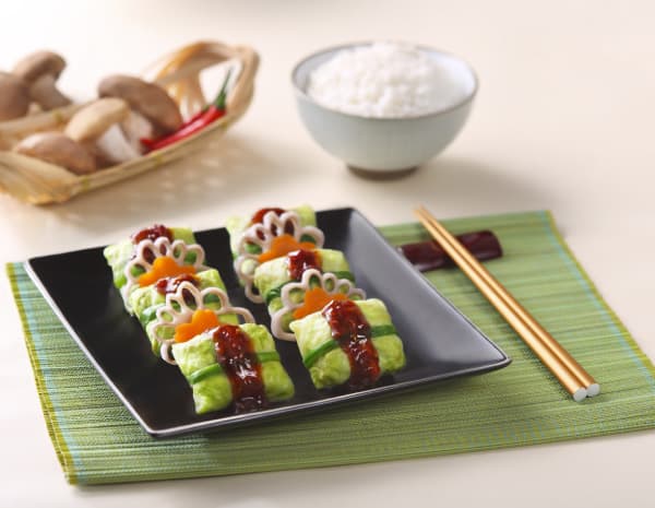Divide stuffing into 8 equal portions. Wrap and enclose each portion in a cabbage leaf, then plate. Arrange carrot and lotus root slices in between each cabbage roll.