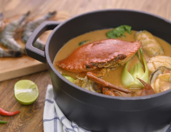 1. Bring 3 packs of Lee Kum Kee Laksa Thick Soup and 1L of water to boil.