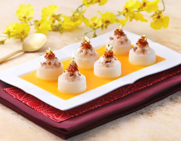 Mince the crab roe. Boil the broth and carrot juice and add the minced crab roe. Add a dash of cornstarch to thicken the sauce. Drizzle the sauce onto the plate and add XO Sauce onto the shrimp paste.