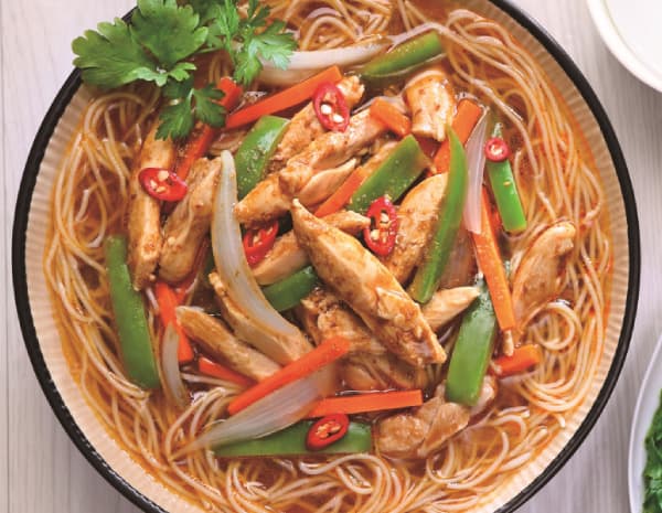 Sauté chicken with 1 tbsp oil until cooked, add all the ingredients (except rice noodle) and mix well.