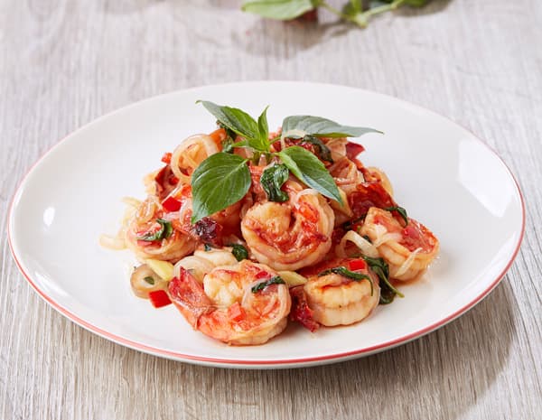 Heat 1 Tbsp oil. Sauté garlic, ginger, shallots, green onions and red chilli until fragrant. Add prawns and sauce mix. Stir well until heated through. Stir in basil leaves and pomelo, serve hot.