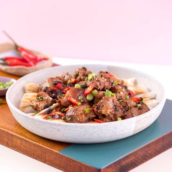 Kecap (Air, Garam, Kedelai, Tepung Terigu), Kacang Hitam Fermentasi (Kacang Hitam, Garam, Air), Bawang Putih, Air, Gula Putih, Garam, Minyak Kedelai, Anggur Beras (Air, Beras, Gandum), Pati Jagung Modifikasi. Mengandung Kedelai, Gandum, Sulfit yang Ada Secara Alami.